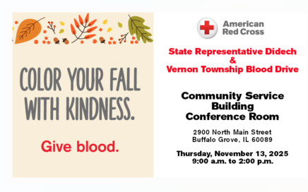 Sponsored by State Representative Daniel Didech and Vernon Township For an appointment, call 1-800-REDCROSS (1-800-733-2767) or visit redcrossblood.org and use the sponsor code: SRDD When: Thursday, November 13, 2025, from 9 am – 2 pm Where: Community Service Building – Conference Room, 2900 N Main St, Buffalo Grove, IL 60089 See flyer for more information.
